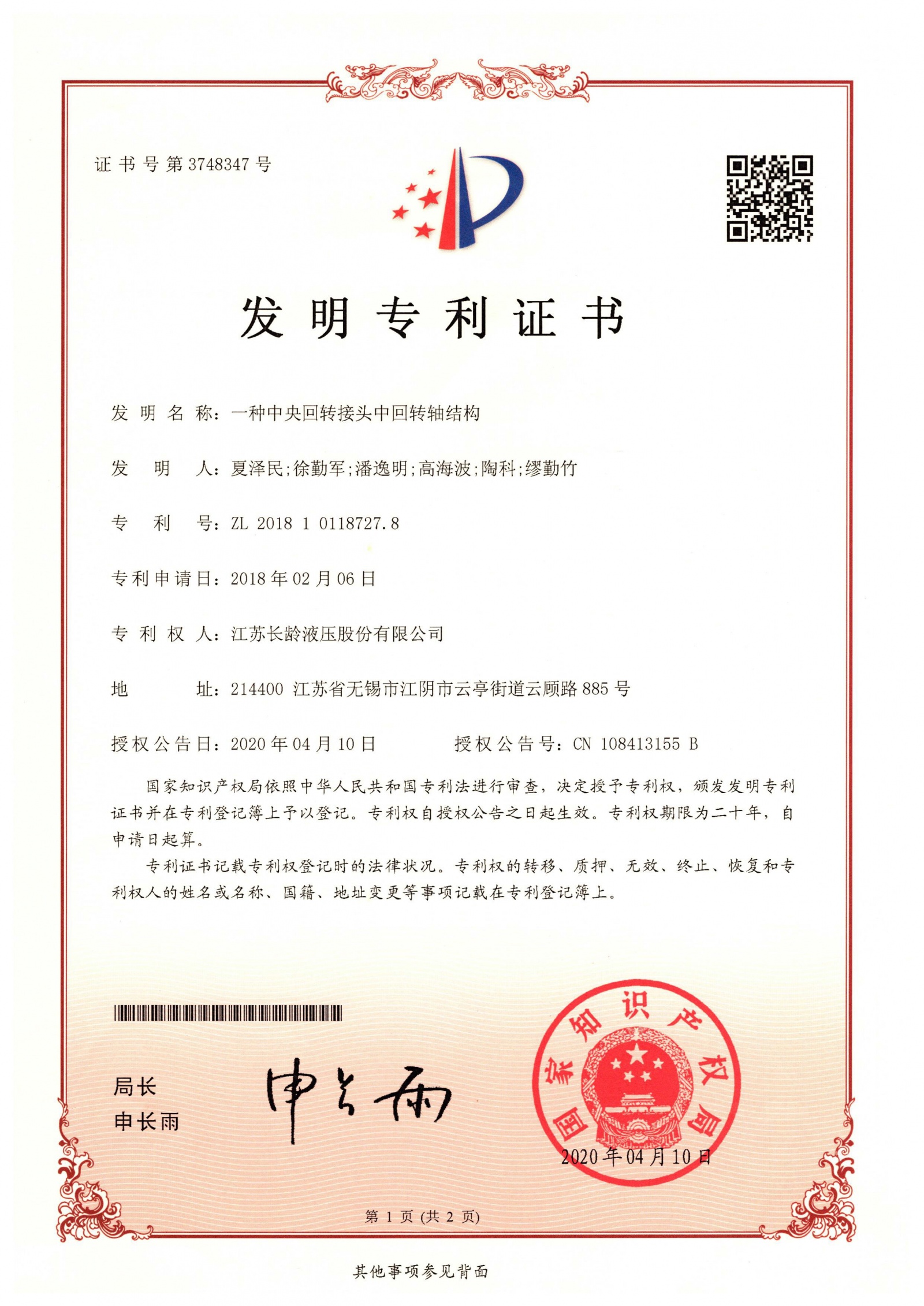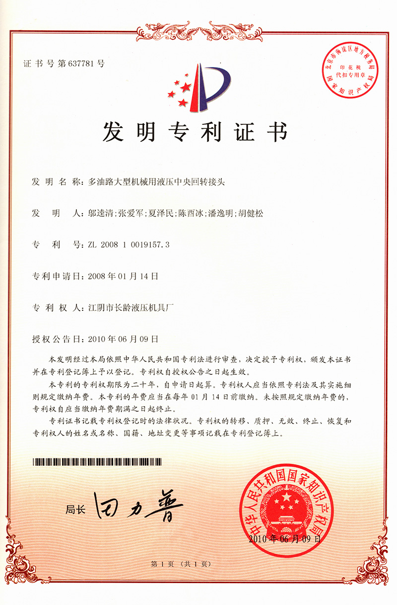 公司新增國有建設(shè)用地45畝,新建廠房18000㎡,企業(yè)整體搬遷至云亭工業(yè)園區(qū)大園里路1號。液壓中央回轉(zhuǎn)接體申報國家發(fā)明專利,2006年獲準(zhǔn)授權(quán)發(fā)明專利。