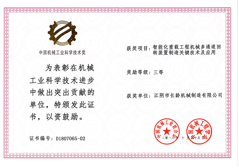 同年,公司總經(jīng)理夏澤民獲評“江蘇省科技企業(yè)家”稱號?!爸悄芑剌d工程機(jī)械多通道回轉(zhuǎn)裝置制造關(guān)鍵技術(shù)及應(yīng)用”獲中國機(jī)械工業(yè)聯(lián)合會/中國機(jī)械工程學(xué)會“中國機(jī)械工業(yè)科學(xué)技術(shù)獎三等獎”。