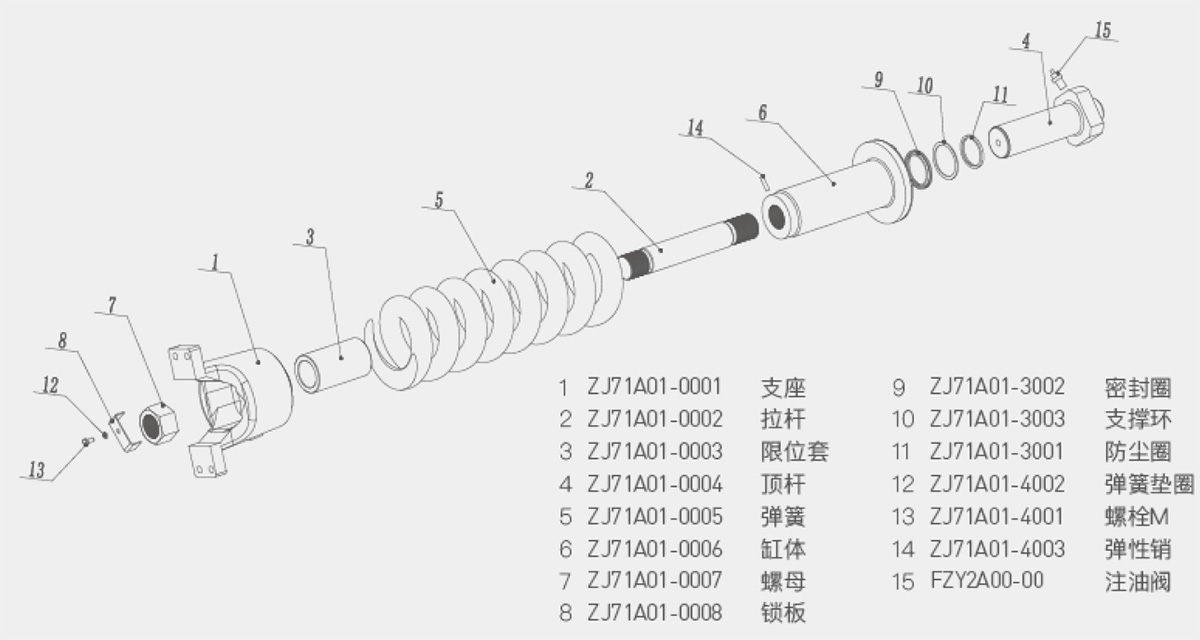 張緊裝置適用于挖掘機、起重機、旋挖機、平地機等全液壓履帶式行走機械,主要功能是實現(xiàn)對履帶的張緊功能?,F(xiàn)配套三一重機,徐工機械,柳工機械,廈工,山東臨工,青島雷沃,龍工機械等國內工程機械廠家,以及外資品牌卡特彼勒、現(xiàn)代重工等。
